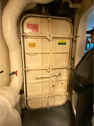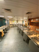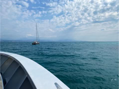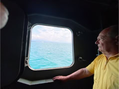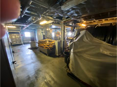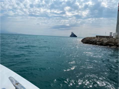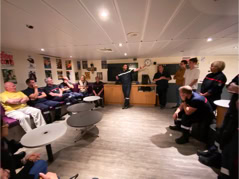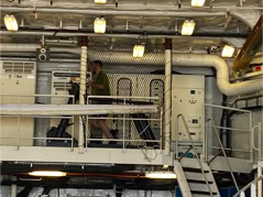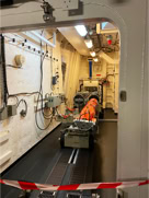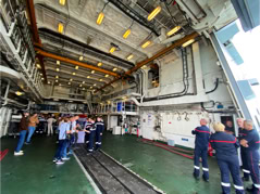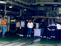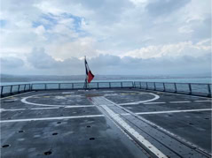 Pour l’anecdote et expliquer la dernière image, la pluie s’étant aventuré lors de la fin de la visite et la mer s’étant montrée assez remuante ne permettant pas à la navette d’accoster la frégate, nous avons été invité par l’équipage à nous rassembler dans le hangar d’hélicoptère pour patienter et à déguster quelques bouteilles… d’eau et des madeleines fourrées à l’abricot… Miam !